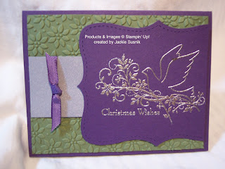 This is a purse gift certificate holder that we made at my recent Christmas Class. It uses the wonderful red flocked Christmas Cocoa Specialty Paper from the Holiday Mini. The stamp set is Delightful Decorations (Page 24 of the Holiday Mini) with the coordinating Ornament Punch. Always Artichoke card stock was cut out with the Big Shot Top Note Die and then dry embossed with the Petal-A-Plenty Embossing Folder. Such a wonderful Christmas gift presentation.